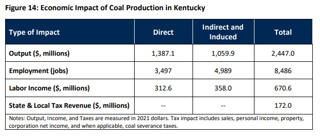 They further estimate that the 3.5 thousand coal mining jobs in Kentucky in 2021 are expected to generate nearly 5.0 thousand additional jobs in the state economy, resulting in a total employment impact of 8.5 thousand jobs. Further, coal production generates more than $670.0 million in labor income in the state.